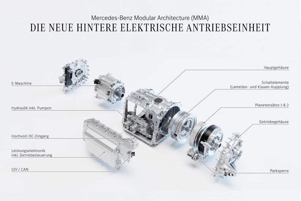 一次減速比はドッグクラッチを介してモーターと直接接続されているのに対し、二速ギアはモーターとトランスミッションハウジング内で多板クラッチによって接続される。電動オーバードライブは60〜110km/hの間で作動し、このシフトチェンジはほとんど気付かない程度だと、AUTO BILDのテスター、ヨナス・ウーリッヒは初試乗レポートで述べている。感じられたのは、せいぜいわずかな駆動力の途切れだけだったという。メルセデスによれば、このシフト動作は0.2秒未満で完了するとのことだ。