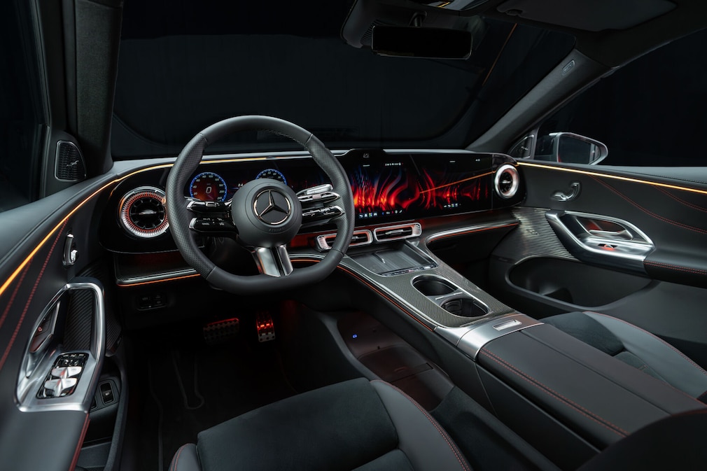 メルセデスが、ビーガン協会(Vegan Society)の認証を受けた「ビーガンパッケージ」を初めてインテリアに採用した。これにより、顧客は、シート、ステアリングホイール、ルーフライニングに至るまで、完全に動物由来の素材を使用していないインテリアを手に入れることができる。もうひとつのハイライトは、透明と不透明を切り替え可能なセグメント化されたパノラミックルーフと、162個の個別に点灯するメルセデススターを備えた統合型アンビエント照明だ。ただし、これらはいずれもオプションであり、標準装備ではない。