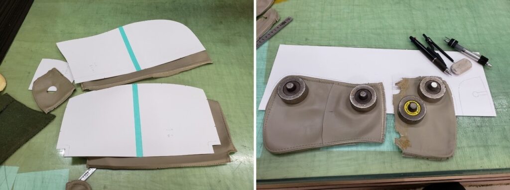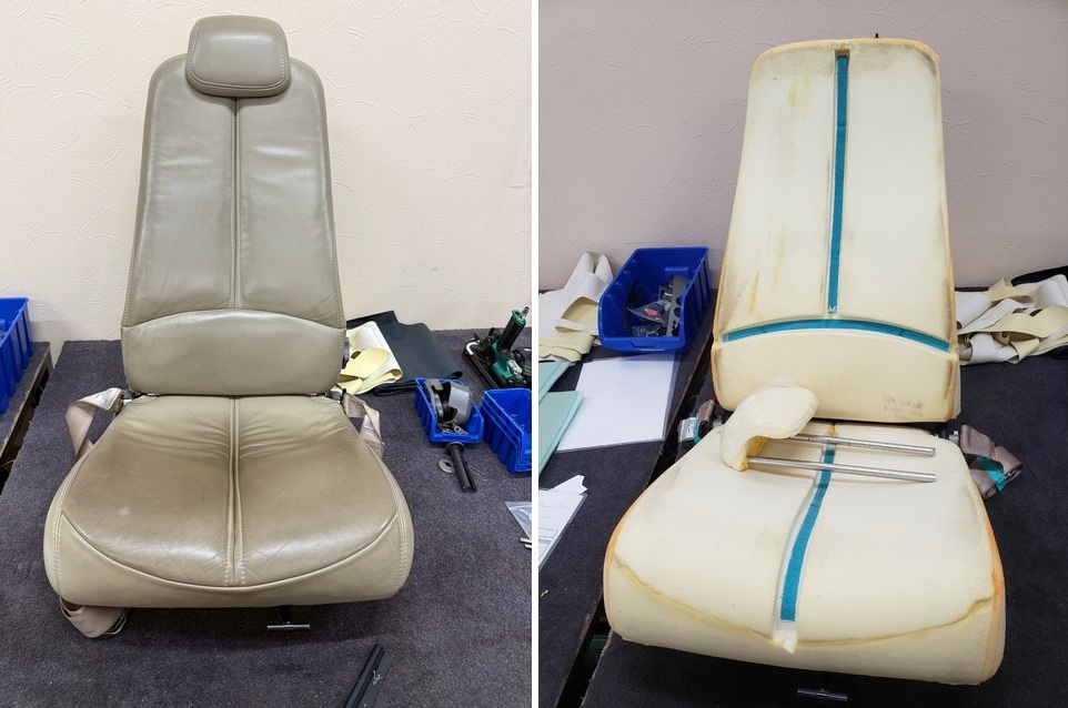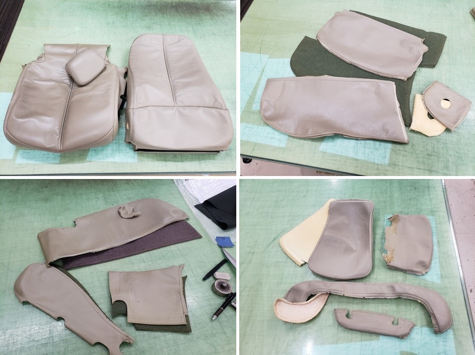 作業はまず、シート、ドアパネル、マットを機体から慎重に取り外すことから始まった。シートのレザー、内張を丁寧に剥がしたあとは、それを精密に型取りする。