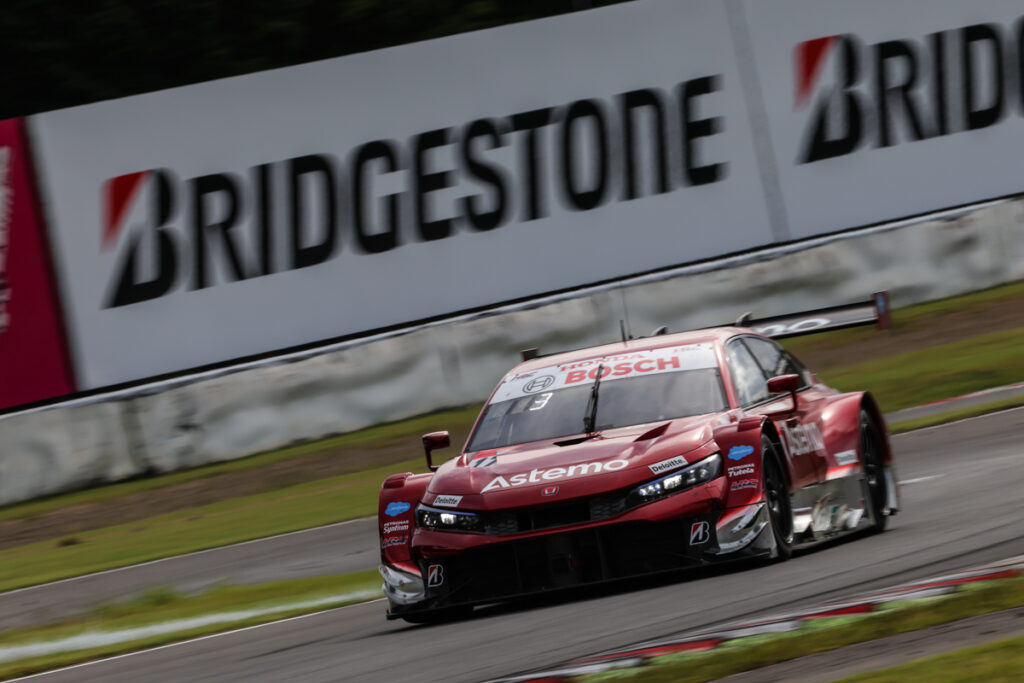 そのセッションでのGT500クラスのトップはブリヂストン(以下BS)を履くNo.17 Astemo CIVIC TYPE R-GT 塚越広大/小出峻 でタイムは1’10.240だ。2番手はダンロップを履く1’10.251を叩き出したNo.64 Modulo CIVIC TYPE R-GT 伊沢拓也/大草りき。3番手はBSを履くNo.3 Niterra MOTUL Z 佐々木大樹/三宅淳詞であった。