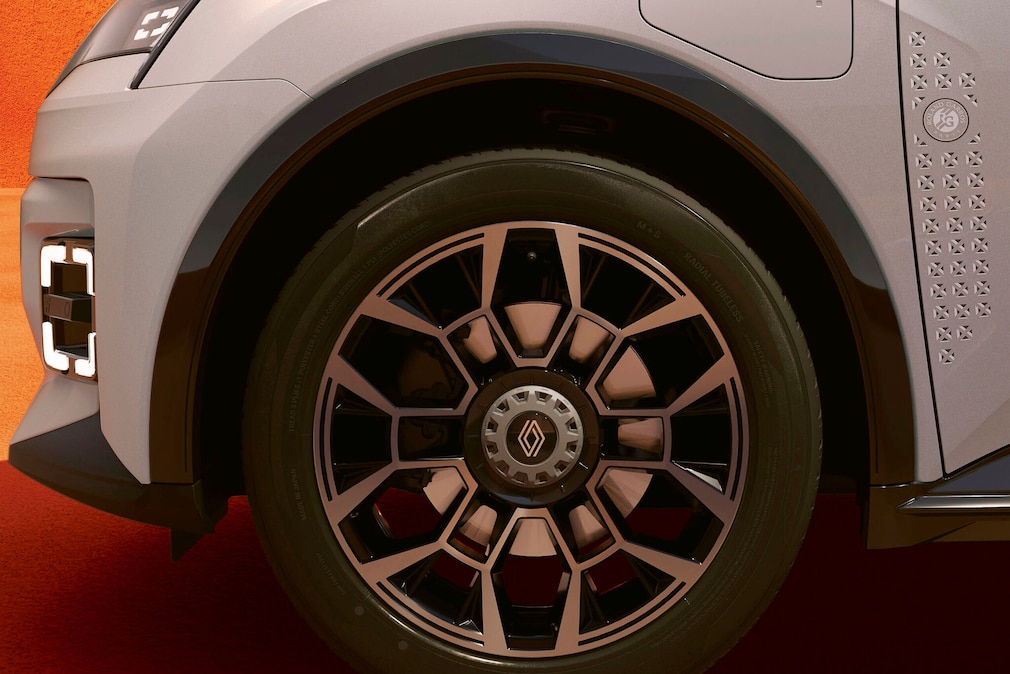 装備のトップクラスには、特別モデルが加わった。「ルノー5 ローラン ギャロス(Renault R5 Roland Garros)」は、最上級グレードである「アイコニック ファイブ」をベースにしており、フレンチオープン(ローラン ギャロス)へのオマージュとして企画された。外観で最も目を引くデザイン要素は、フロントタイヤ後方にある。