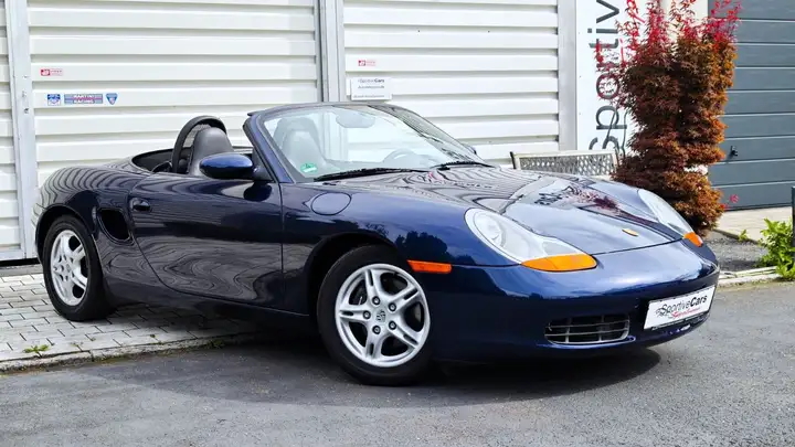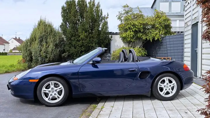 ドイツの中古車情報:ポルシェ ボクスター(986):ラピスブルーのロードスター、25年近く経っているが、驚くほど新しい状態。