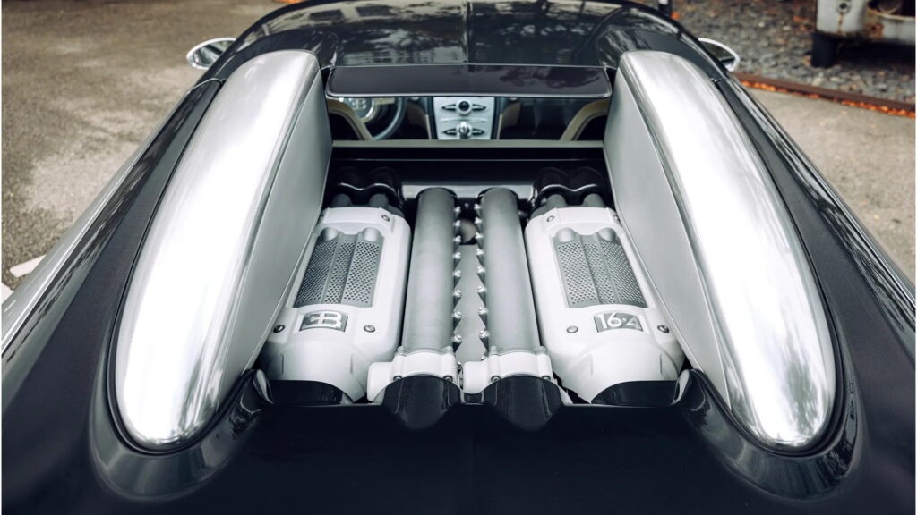 「ピュール サン」は、「ヴェイロン16.4」と同様、4基のターボチャージャーを備えた8リッターW16エンジンを搭載している。出力は1,001馬力、最高速度は407km/h、0-100km/h加速は2.5秒だ。塗装や断熱材を使用していないため、「ピュール サン」は量産型の「ヴェイロン」よりも約90kg軽量(1,798kg)となっている。