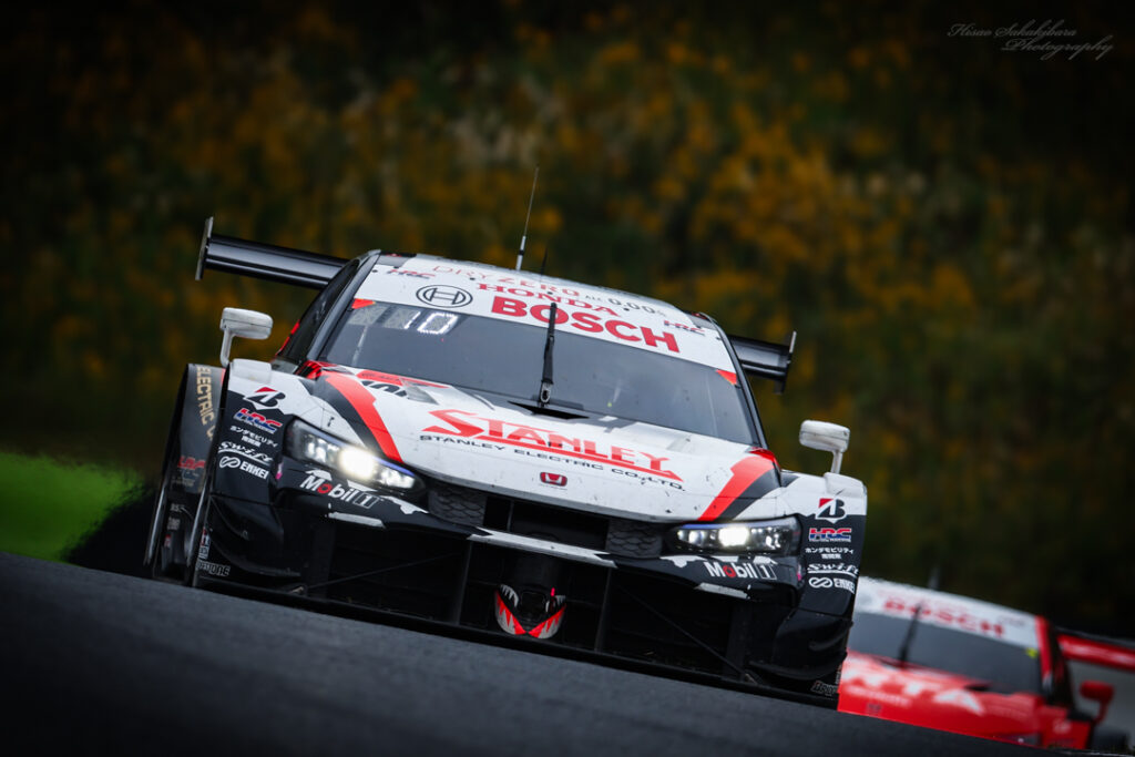 コンディションが読めない前日の予選はドライからハーフウェットに変化する中で大混戦となった。ニスモ勢のワンツーによるレーススタートとなったが、ポイントリーダーのNo.1 auがまさかのリタイアになり、大逆転優勝賞を果たしたのは何とNo.100 STANLEY CIVIC TYPE R-GT 山本尚貴/牧野任祐に。