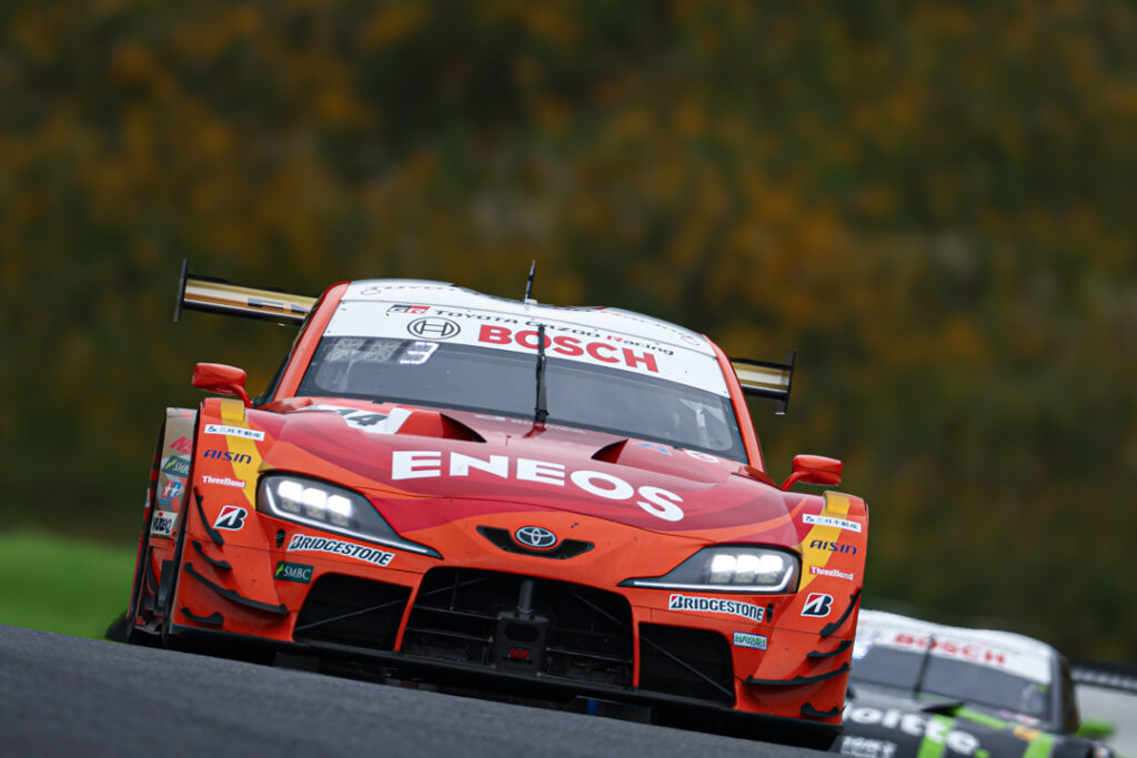 7番手スタートでポイントリーダーのNo.1 au TOM’S GR Supra 坪井翔/山下健太がまさかのマシントラブルによりリタイア!ポイントランクはトップをキープしいるが、2位No.14 ENEOSとの差が6ポイント差に縮まり、非常に面白い展開となった。