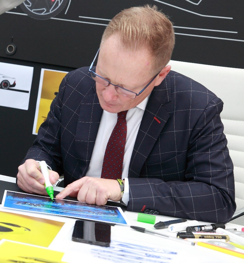 ボルケルト氏は今、一番乗っているデザイナーの一人だろう。レヴエルトとテメラリオはどちらも今後のランボルギーニのスポーツカーラインを形成する重要なモデル。その2車のデザインを成功裏に完成させた。今日の主役であるフェノメノも彼のペンの先から生まれた秀作だ。多忙を極める当代一流のデザイナーだけに、私はちょっと近寄りがたい人物を想像していた。ところが間近で見る氏はこうした先入観とはまったくの反対で、笑顔をたたえて来場者サービスにこれ勤める姿が印象的だった。