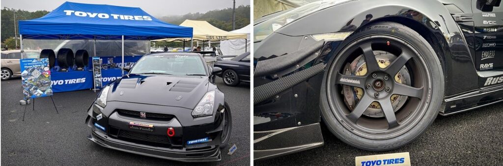 TOYO TIRESは、「Rush Factory」のR35型日産GT-Rのデモ カーを展示。ブースには、さまざまなGT-Rユーザーにも愛用されている「PROXES R1-R」、「R888 R Drive」、「PROXES Sport 2」を展示。