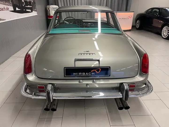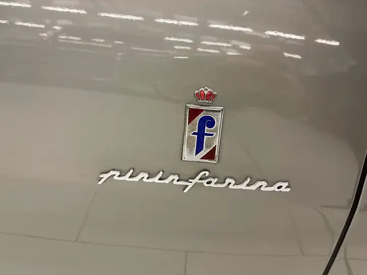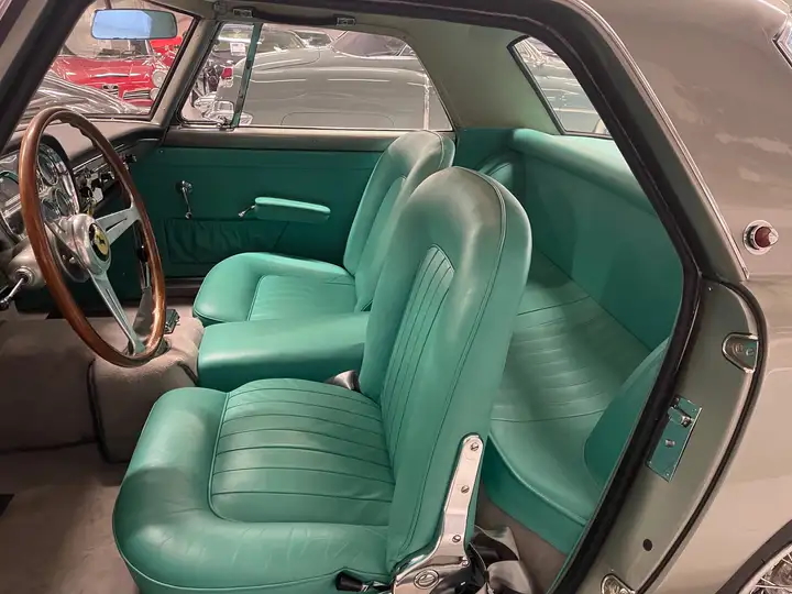 クーペは、「グリジオ コンキリアMM16249」と、アクアマリン色のレザーインテリア「ペッレ ヴェルデ3476」の組み合わせで、エレガントな印象を与える。ピニンファリーナがデザインしたラインは、65年経った今でもモダンな印象を与える。
