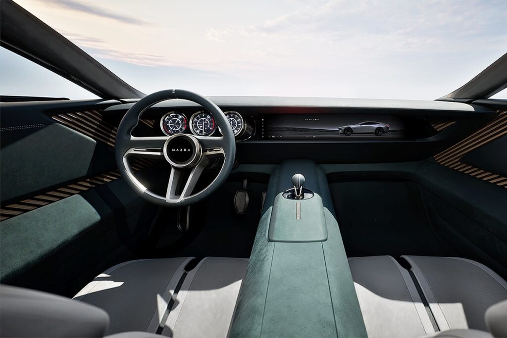 このコンセプトも”less is more”というモットーが当てはまる。コックピットは明確に構造化されており、アナログ計器がインテリアに魅力的なレトロなタッチを加えている。特にエキサイティングなのは、型破りな構造を持つプラグインハイブリッドという駆動コンセプトだ。内燃エンジンは、2ローター、ターボチャージャー付きロータリーエンジンで、電動モーターによってサポートされている。システム出力は510馬力、マツダは電気での走行距離は160km、総走行距離は最大800kmと発表している。