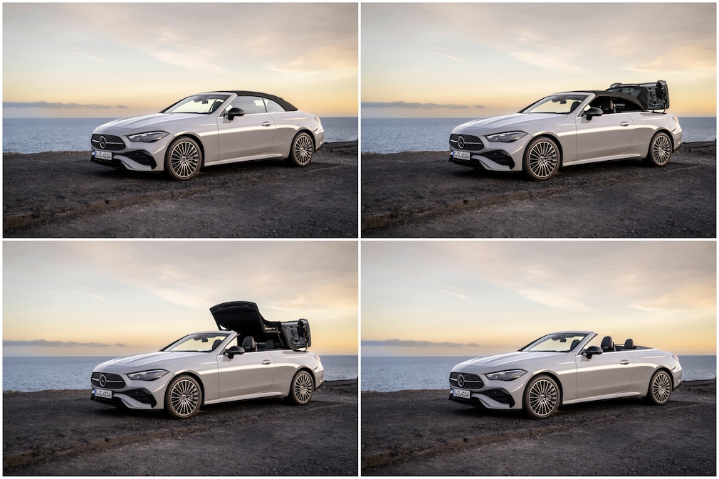 カブリオレのソフトトップは、ボディラインに調和して溶け込み、閉じた状態でも開いた状態でも見事なプロポーションで、力強くエレガントな存在感を放っている。「CLEカブリオレ」の多層構造で厚手のソフトトップは、20秒で静かに折りたたまれ、後部に収納される。