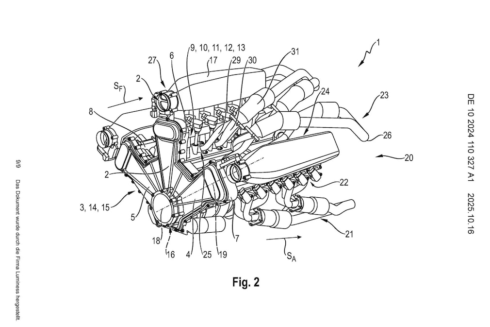 エアインテークは上部にあり、吸気経路は極めて短い。これにより、効率が向上し、摩擦が減少、そして空気と排気ガスの流れが明確に分離される。特許庁によれば、最大3つのターボチャージャーまたはコンプレッサーを設置するスペースも確保されているとのことだ。