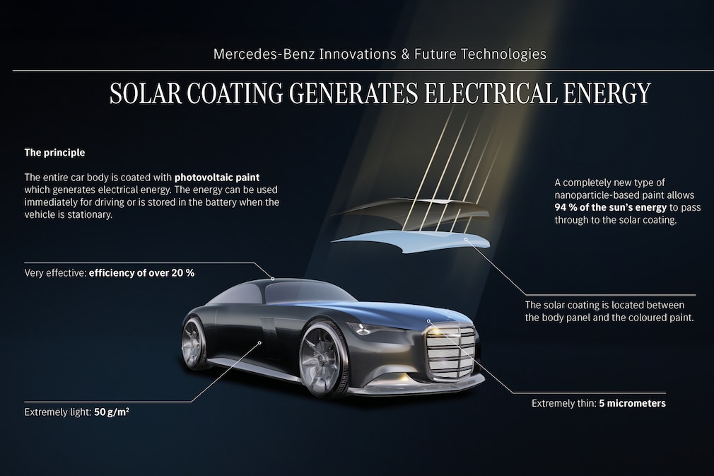 日産やトヨタなどの他のメーカーもソーラー技術を開発しているが、メルセデスのアプローチはさらに一歩進んでいる。ソーラーセルは目に見えないように組み込まれており、デザインを損なうことなく、ガラス屋根や追加モジュール上のスペースを必要としない。