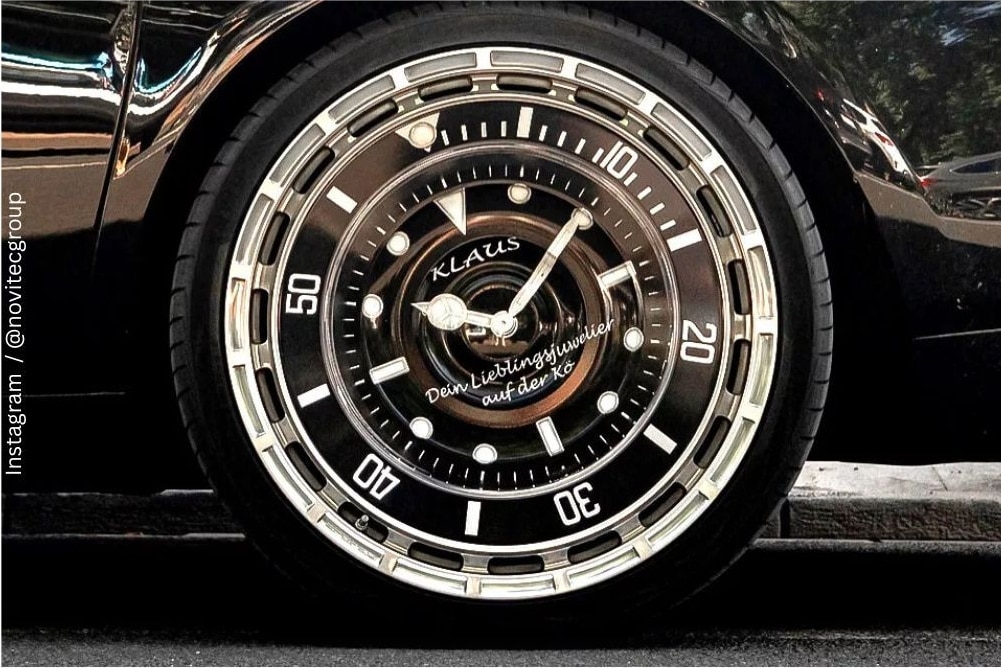 このホイールは、繊細なミニッツストライプ、溝のあるエッジ、明確なタイポグラフィで、ロレックスのサブマリーナーの「ベゼル」を彷彿とさせる。中央には「クラウス」の文字が誇らしげに刻まれ、そのすぐ下には「ケー通りで一番のお気に入りの宝石店」と書かれている。