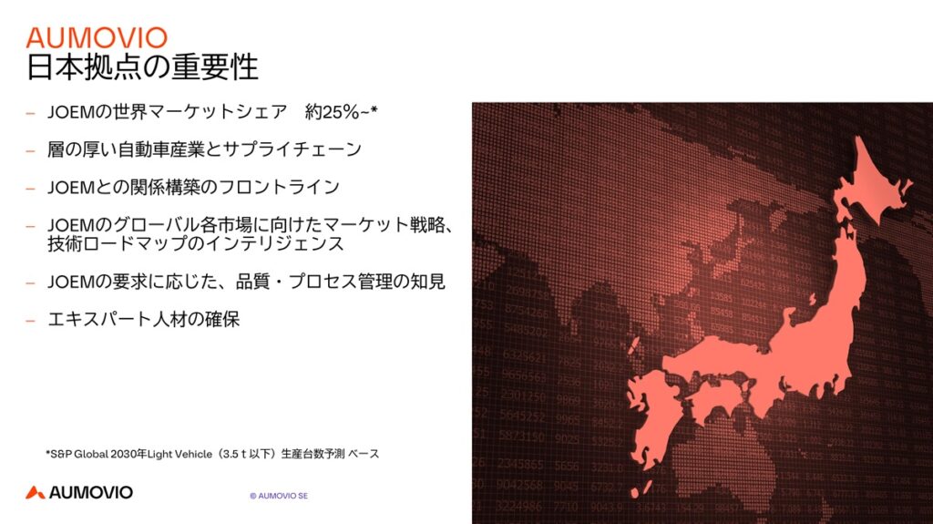 日本の自動車メーカーの2030年のグローバルシェアは25%(生産台数予測ベース)を保つことを例に挙げ、「日本はAUMOVIOにとって非常に重要な市場に位置づけられています」と難波氏は強調する。