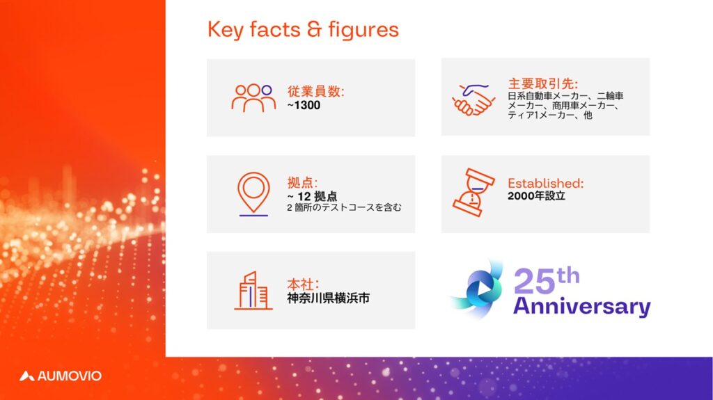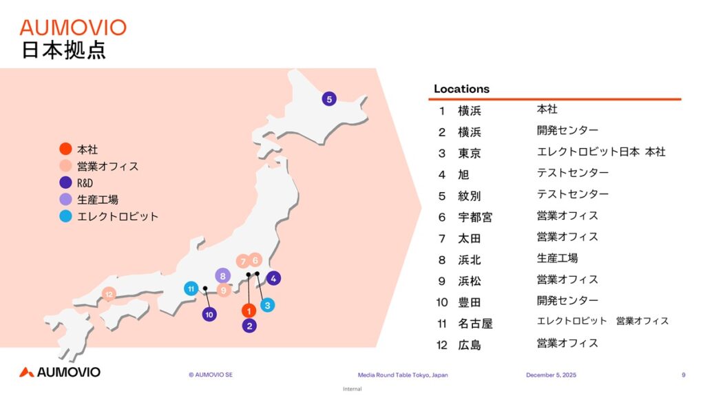 AUMOVIOの日本の拠点は上の写真が示す通りで、北海道・紋別と千葉・旭にテストセンターを所有、日本の自動車メーカーの所在地をカバーするサテライトオフィスを構え、従業員数は約1300名を数える。