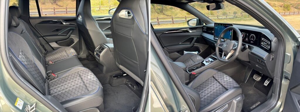 シプレッシーノグリーンメタリックという上品なボディーカラーを纏ったティグアン TDIのインテリアは、グレー基調の明るい室内、掛け心地の良いファブリックシートによって乗り始めから最後まで快適であった。フロントのスポーツシートは適度な張り出しで上半身をサポート、ドライビングポジションも合わせやすい。リアシートもしっかりとホールドしてくれて、背もたれの角度もいい具合なのでリラックスしてドライブを楽しめる。