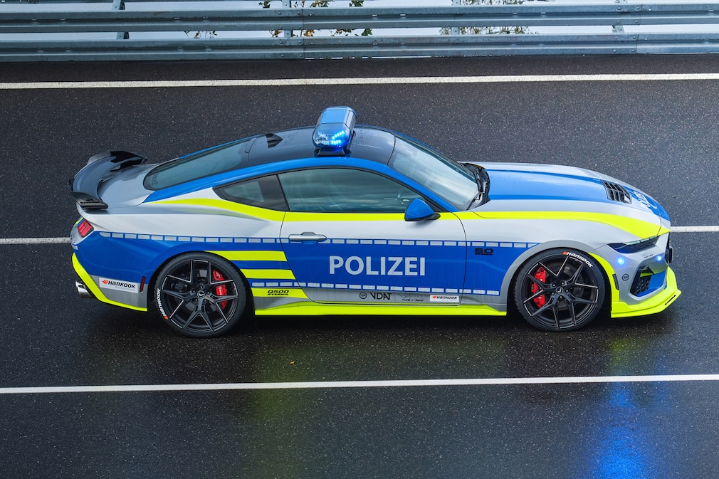「マスタング」は、見た目も魅力にあふれている。「Foliatec.com」製のパトカー仕様のラッピングは、シルバーのベースに青と黄色のアクセントが加えられており、まるで本物のパトカーのように見える。「Hänsch」社の最新の屋根のライトおよび警告ランプ(ルーフバー、リア警告システム、停止用フラッシュライトなど)がこの印象をさらに強めている。