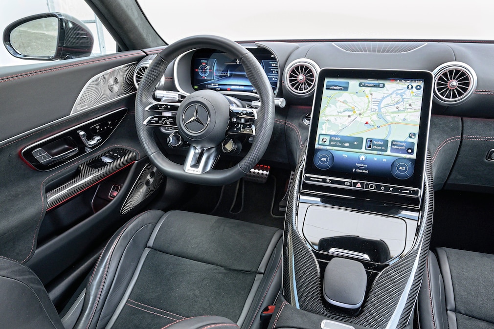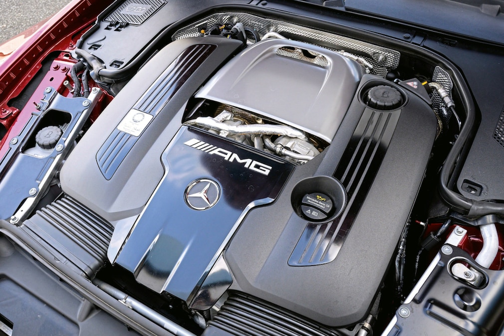 AMGスピードシフト「MCT 9G」と「M177」4.0リッターエンジンが一体となって生み出すパフォーマンスは、まさに圧巻だ。エンジンは低回転域では唸りと咆哮を響かせ、中速域では鋭く噛みつくような加速を見せ、高回転域では官能的な盛り上がりとともに鼓動する。どの回転域からでも軽やかにパワーが湧き上がり、AMG製V8ならではの魅惑的なサウンドスケープがドライバーを包み込む。トランスミッションは鋭く電光石火のスタートと瞬時の変速を可能にし、トルクコンバーターを持たない構造により、驚異的な加速と減速性能を実現している。