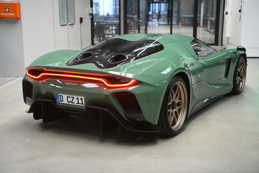 ホールの内部は、まるで宇宙ミッションのクリーンルームに足を踏み入れたかのようだ。大きなガラス窓の向こうでは、NASAの技術を思わせるシャシー部品が生み出されている。開発工房の中で、それは突然、私たちの前に姿を現す。ステージも演出照明もない。ただのコンクリート床とネオンライト、そしてザガートが万年筆で描いたかのようなボディ。象徴的な「ダブルバブル」ルーフドーム、長く筋肉質なライン、狂気のモグラ塚のようなディフューザー。その下には、カプリコーンによるドイツ流エンジニアリングが息づいている。