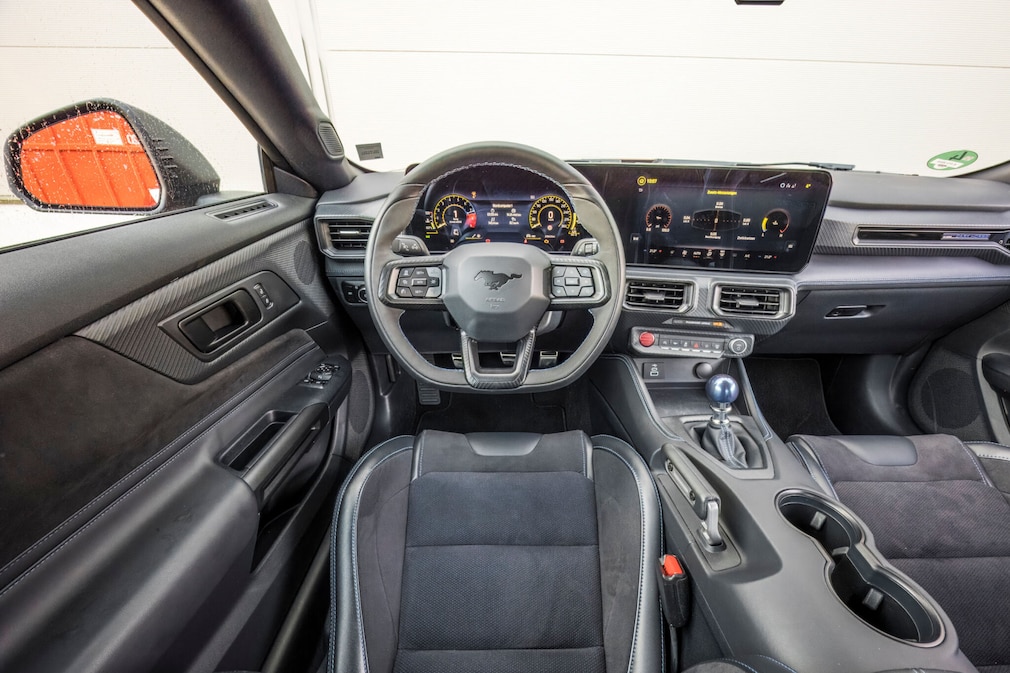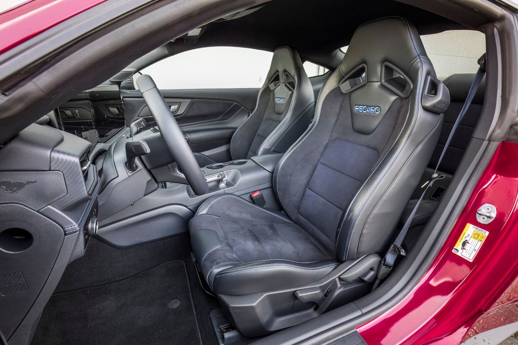 室内に目を向けると、「マスタング」はあくまでマスタングだ。素材は明らかにシンプルで、傷が付きやすい部分もある。レカロ製シートはやや柔らかめだが、それでも全体として十分な魅力を備えている。デジタルメーターは1967年型風や90年代調の表示に切り替え可能で、多数のデジタル補助メーターや、回転数を自由に設定できるローンチコントロールも備わる。