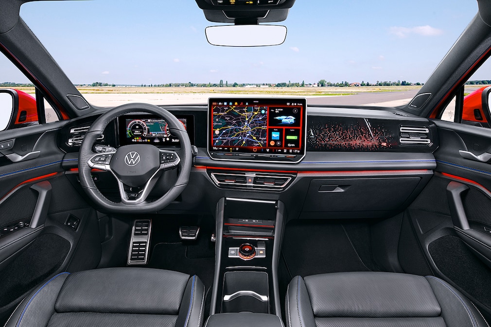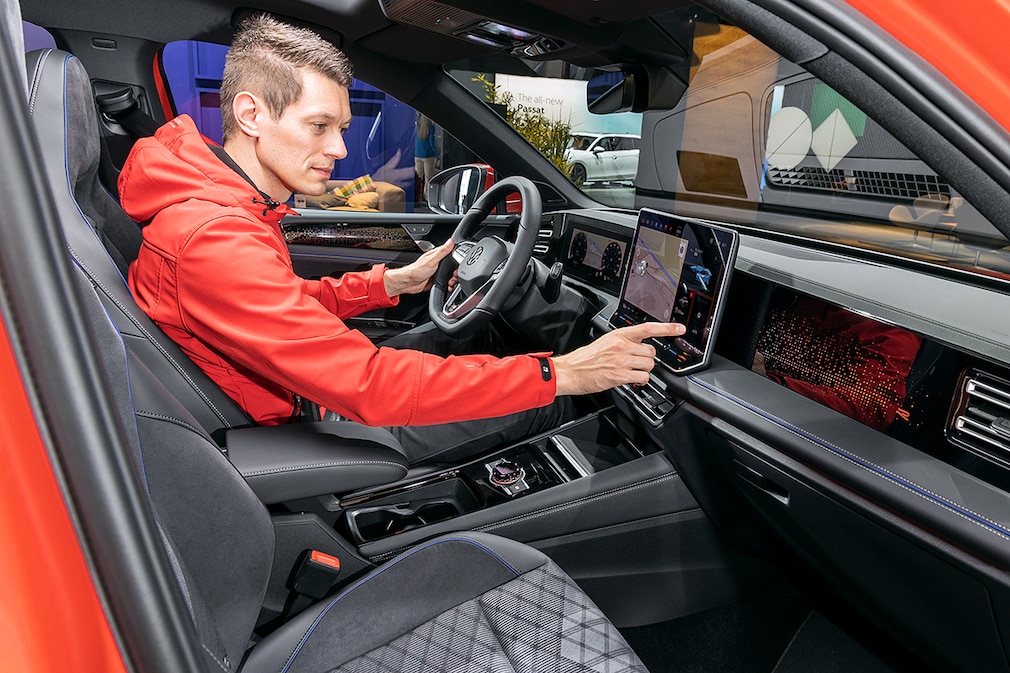 インテリアは、新しいパサートを彷彿とさせる。理由は明快で、プラットフォームも技術も共通だからだ。もちろん、これはネガティブな意味ではない。むしろ、この組み合わせは高く評価できる。ステアリングホイールにはクラシックな物理ボタンが採用され、15インチのセンターモニター(標準は12.9インチ)の下部に配置されたエアコンおよび音量調整用のスライダーはイルミネーション付きとなっている。