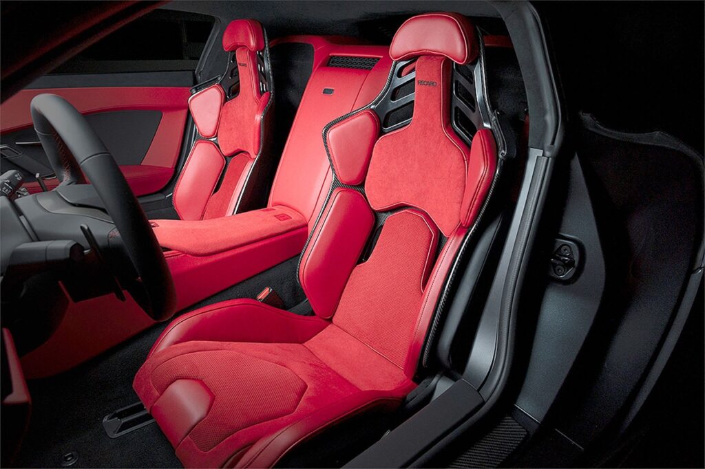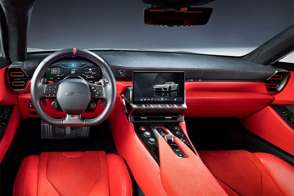 赤いレザーとアルカンターラを基調とした「GR GT」のインテリアで印象的なのは、トヨタのロゴが見当たらない点だ。その代わり、12時位置のセンターマーカーを備えたレザーステアリングの中央には、「GT」の文字が誇らしげに配されている。また、いかにスポーティな志向を掲げていようとも、視界性能がおろそかにされていない点も見逃せない――さすがはトヨタである。