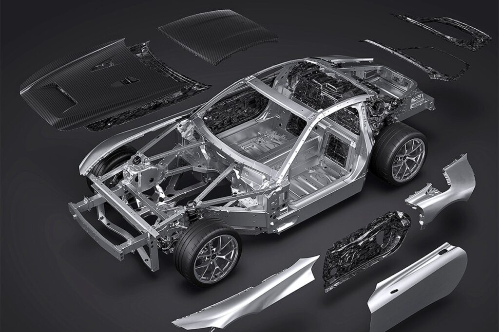 「GR GT」のロードゴーイング仕様に話を戻そう。GR開発チームがとりわけ重視したのは、低重心化と前後重量配分の最適化である。その実現手段として採用されたのが、大型キャストノードを組み合わせたアルミ製スペースフレームに、ボルト留めのプロファイル構造、さらにCFRPおよびカーボンファイバー製のボディパネルを組み合わせる構成だ。目標車両重量は最大で1,750kgに抑えられている。