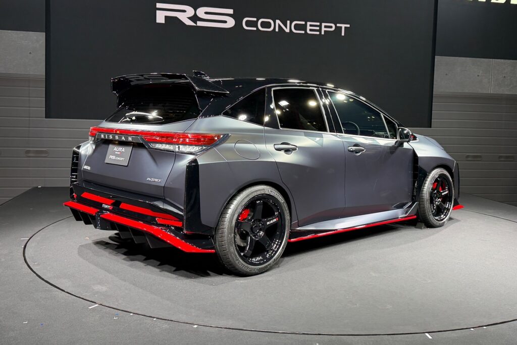 そして今、ニスモチームが、このショーのスターに、かなりの高性能の遺伝子を導入して、その実力を存分に発揮する機会を得た。通常の「オーラ ニスモ」のスポーティーな外観を「RS」ではさらに威圧的にして、車幅は14cmも拡大され、2cm低くしゃがみ込み、左車線(もちろん日本で)を走る保守的なドライバーたちに、威圧的なウィングを誇示している。