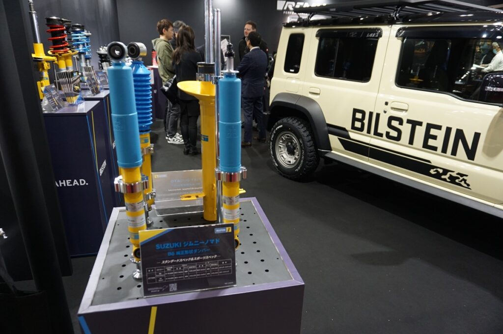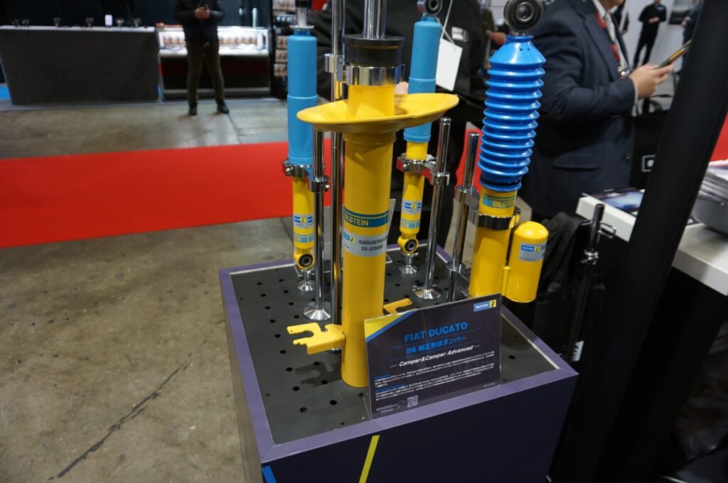 阿部商会ブースの中核となったのが、ビルシュタインとアイバッハのサスペンション関連製品の展示だ。ビルシュタインの目玉は2つで、一つは「スズキ ジムニー ノマド」用の純正形状ダンパーだ。オンロードでもオフロードでもさらなる乗り心地の向上が期待できる。もう一つは「フィアット デュカト」用純正形状ダンパーで、こちらはキャンピングカーユースのデュカトを想定した製品となっている。
