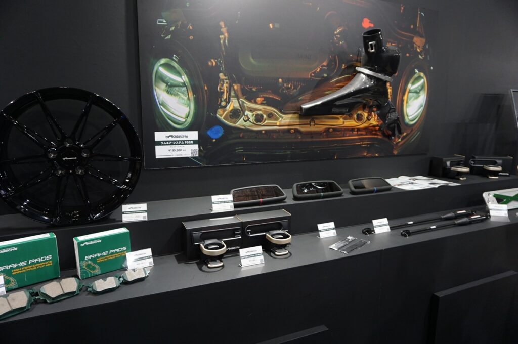 阿部商会のブース構成は、足まわり、排気系、インテリア/エクステリアまで幅広いパーツ群を実際の装着車両とともに展示。製品の機能性と装着イメージを具体的に伝えることで、来場者が自分の愛車のカスタマイズプランを描きやすい構成となっていた。