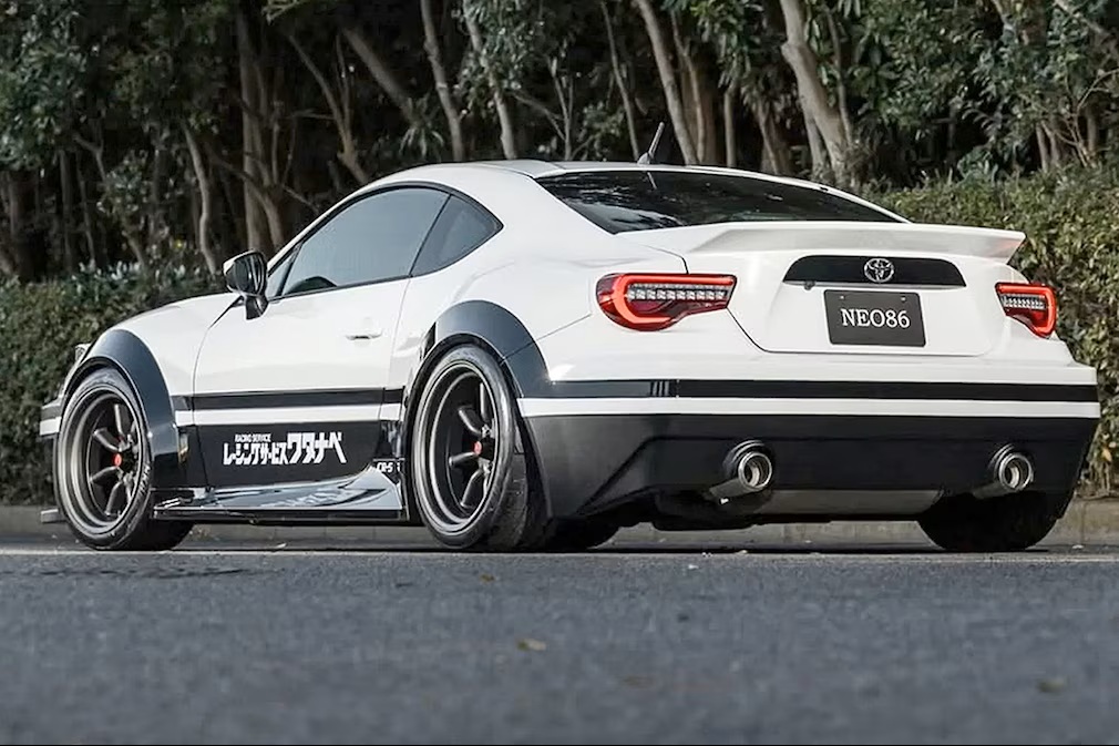 リザルトジャパン(Result Japan)による「Neo86」キットは、初代「GT86」を名車「AE86」への完成度の高いオマージュへと変貌させる。もともと丸みを帯びた「GT86」のフロントは全面的に再設計され、「AE86」の雰囲気をうまく再現している。ボンネット、フェンダー、フロントバンパーが交換されているが、最大の特徴はやはりリトラクタブルヘッドライトだろう。ホワイトとブラックに塗り分けられたパンダカラーも「AE86」のイメージ作りに貢献している。