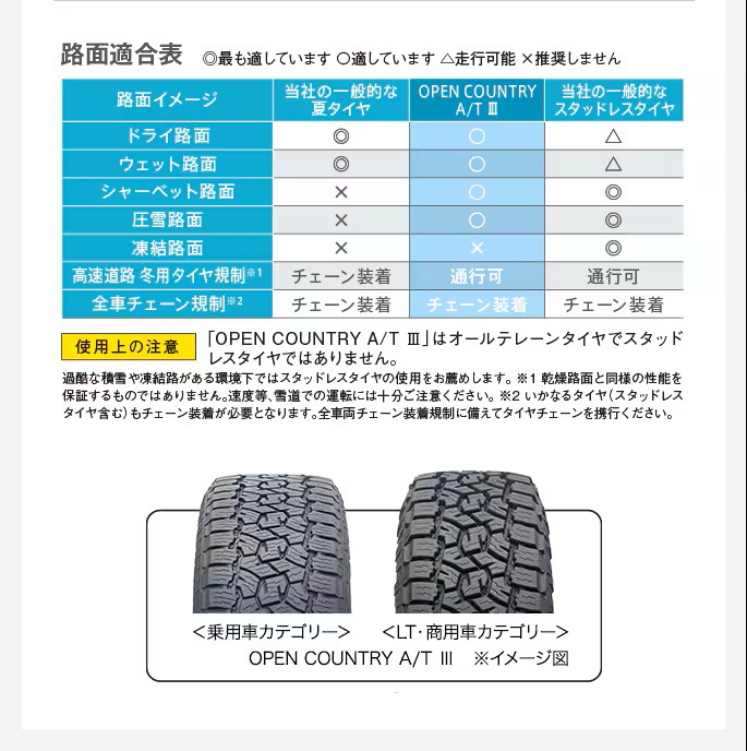 TOYO TIRES OPEN COUNTRY A/T III:https://www.toyotires.jp/product/opat3