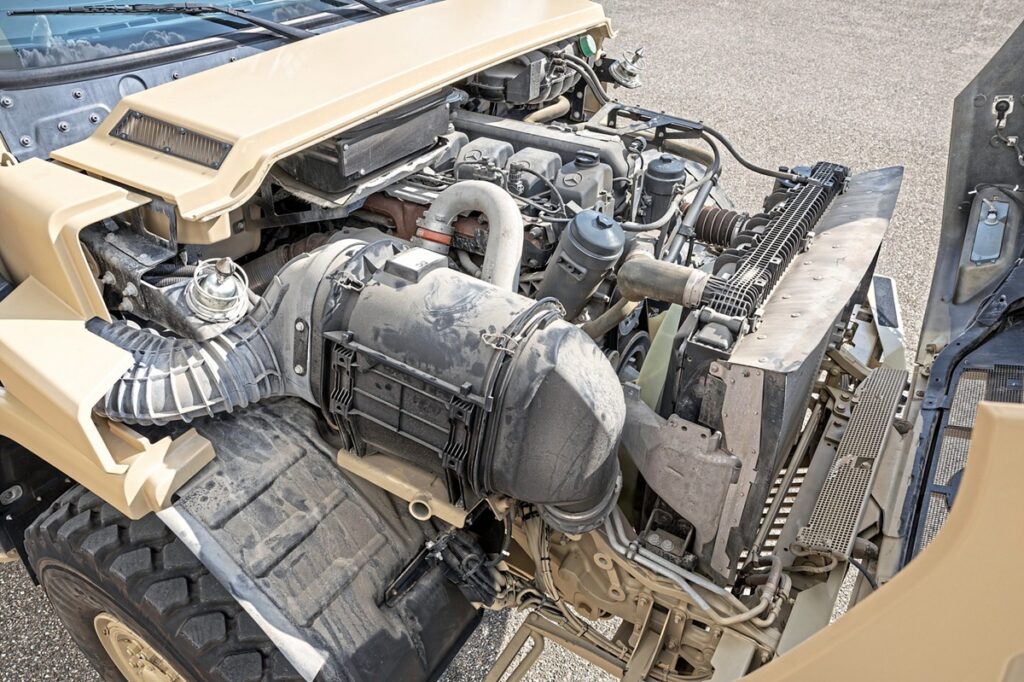 渡河水深75cmを確保したことで、車両総重量26トンの「アロクス2646 6×6」は、より深い水域の走行が可能となった。これに伴い、エンジン、アクスル、トランスミッションの各ベントには改修が施され、電装系の配置も変更されている。整備および潤滑給脂ポイントは、すべて赤色でマーキングされている。また、車両は出動まで数週間待機することが多いため、クイックスタート用ソケットを備え、次回始動に向けてバッテリーを迅速に充電できる。