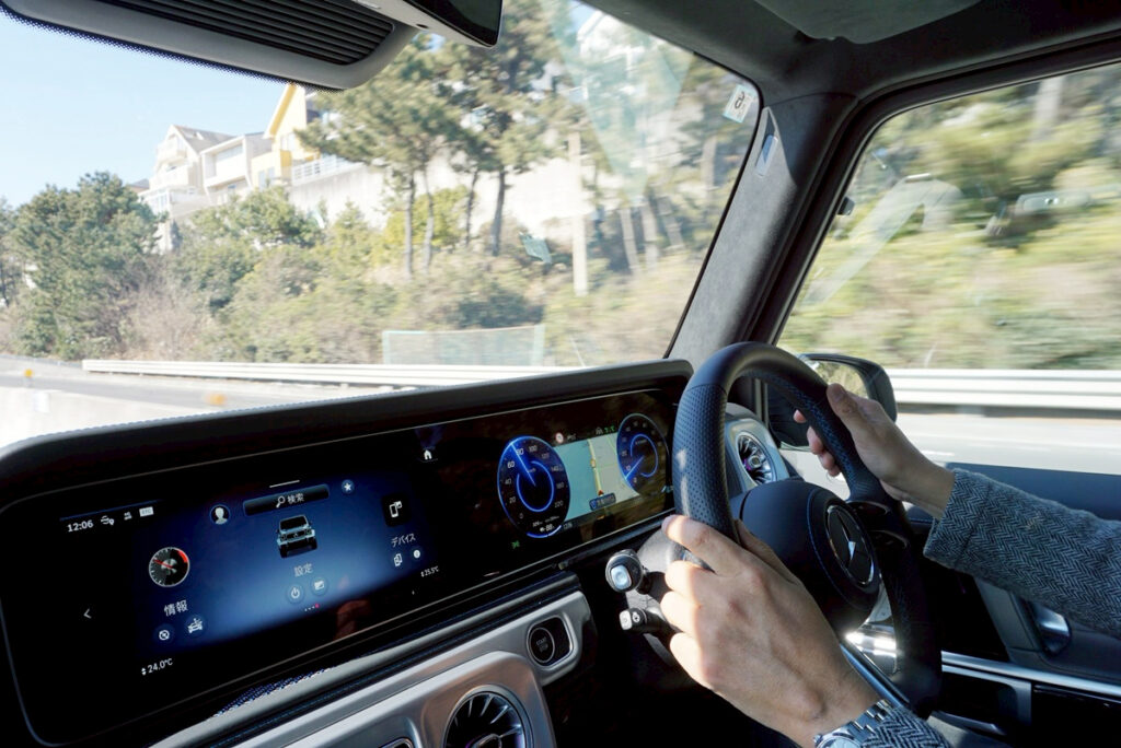 ガチャッと開くいつものドアを開けて乗り込めばそこはまごうかたなきゲレンデヴァーゲンの世界ではあるが、スイッチをONにし走り始めると音もなくヌメッと走り出すところに違和感を覚える。そのまま西湘バイパスに乗って大磯の合流で一旦停止し、本線に合流しようとアクセルペダルを深く踏み込むと、3トンを超える車輛は滑らかなまま、しかし傲然と加速した。