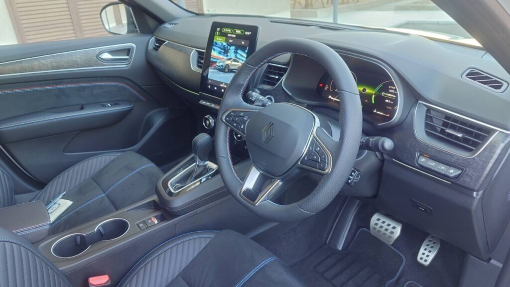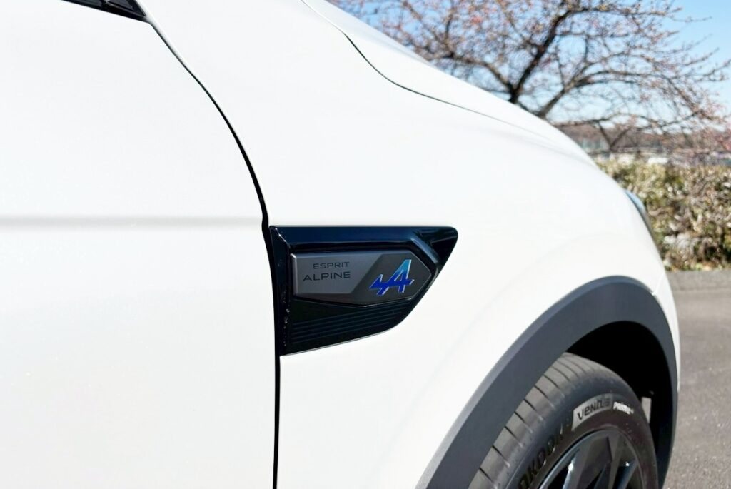 さて、今回試乗したアルカナのトップグレードのエスプリ アルピーヌ フルハイブリッド E-Techの”エスプリ アルピーヌ”という言葉の部分だが、何かしらアルピーヌのさじ加減的なチューンでも施されているのかと期待したのだが、その部分だけは残念ながらコスメティックスなチューンにすぎなかった。具体的にはフロントフェンダーのアルピーヌのロゴのバッチだったり、シートの青い「A」のステッチだったり、ドアのトリコロールカラーの青赤白ステッチだったりがエスプリアルピーヌな部分で、サスペンションチューニングやエンジンになにか特別な細工が追加されているわけではない。