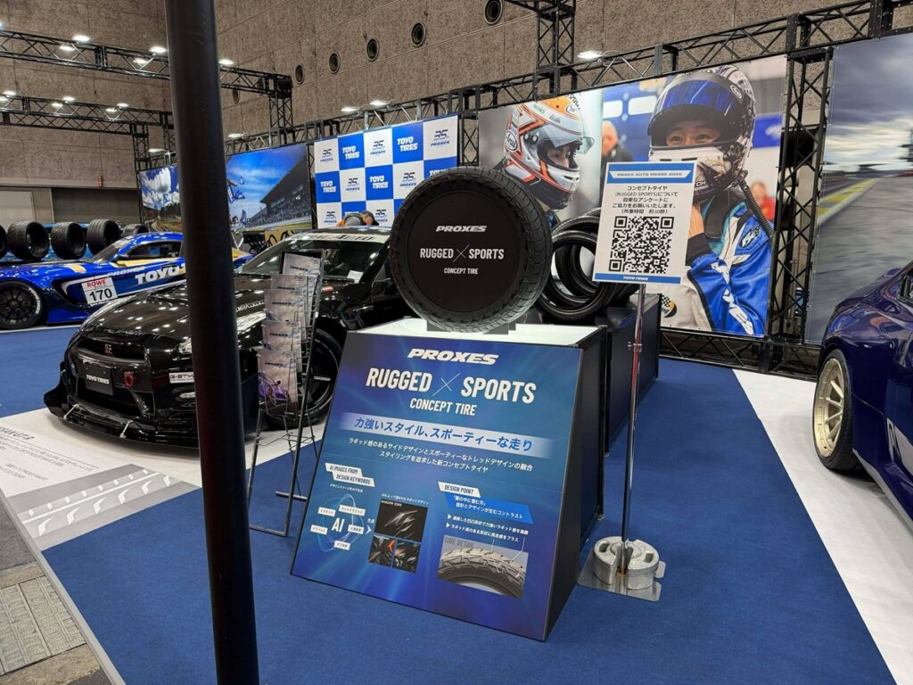 タイヤ展示では、コンセプトモデル「PROXES Rugged Sport Concept」が披露された。サイドウォールに力強い造形を採用し“Rugged(ラギット)”な印象を強調する一方、トレッド面にはスポーツタイヤのパターンを取り入れることで、見た目の力強さとスポーティな走行性能の両立を狙ったコンセプトだ。担当者は「スタイリングとスポーティーな走りを追求したタイヤ」と説明している。
