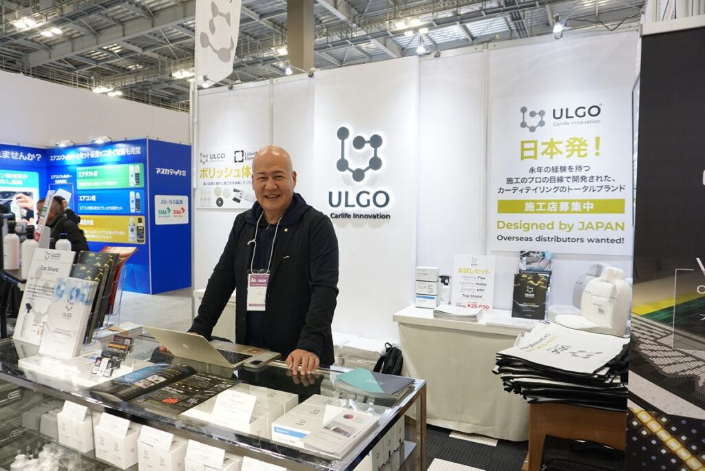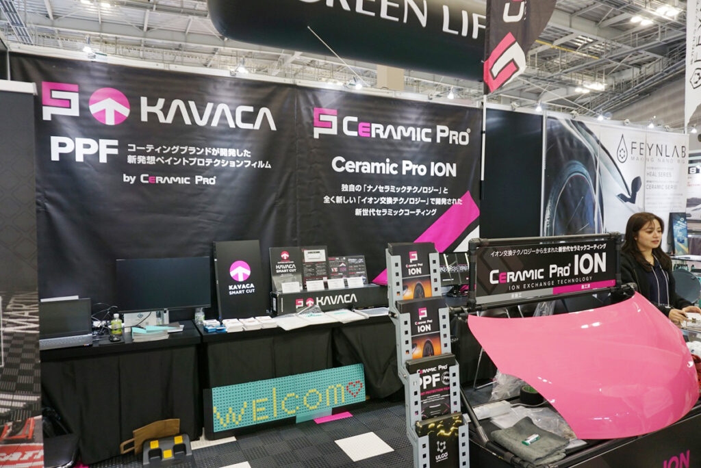 ここからは日本の出展社をご紹介します。カーディテイリングショップの最大手「カーメイクアートプロ」がプロデュースするセラミックコーティングブランドの「ULGO」。商品ラインナップはインテリアコーティングからインテリアリペア商品まで幅広く展開している。高級輸入車ディーラーの内製化のサポートも行っている。また、同社が取り扱う「CERAMICPRO」からPPF(プロテクションフィルム)の「KAVACA」が登場。顧客の多様なニーズに応えている。