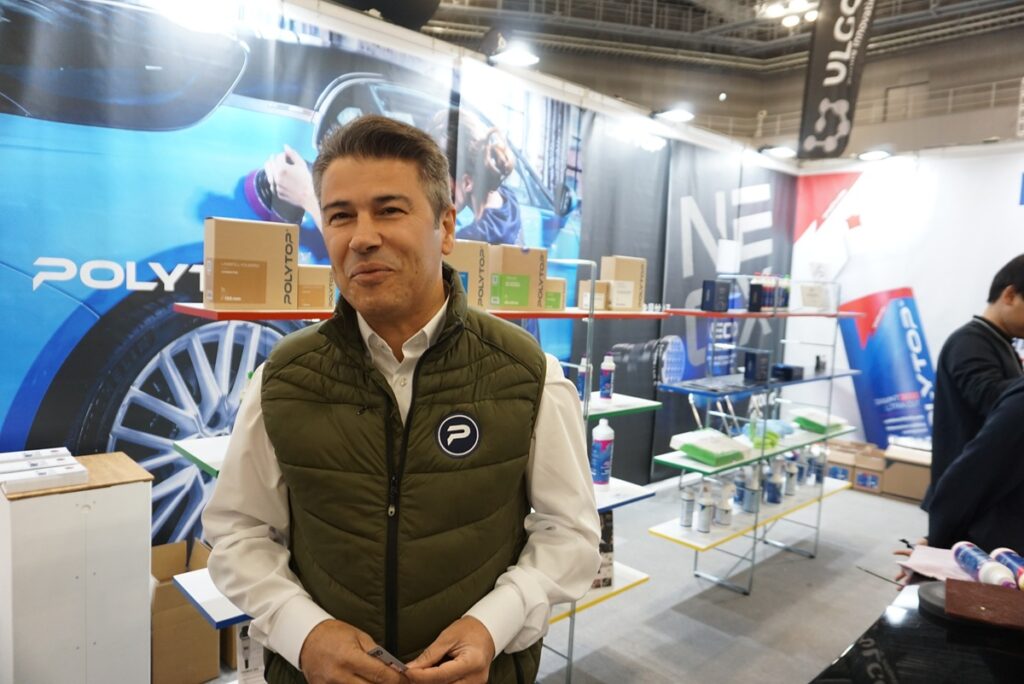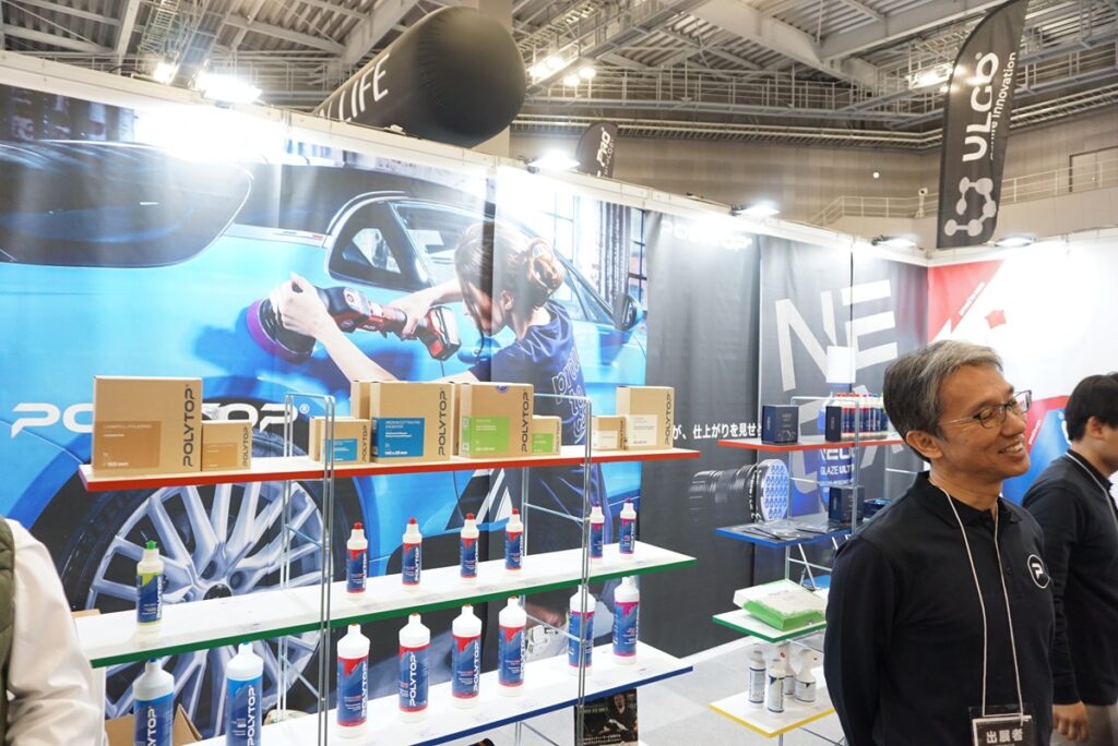 ドイツ系の出展社は続く。「POLYTOP」というカーケア商材の総合メーカーで洗剤、コンパウンドをはじめ周辺機器まで取扱商品が非常に多い。日本ではアスナルというカーディテイリング商材の商社が日本販売代理店として取り扱っている。IAAEにはドイツからセールスマネジャーのタナー氏が来日して商品の説明をしてくれた。