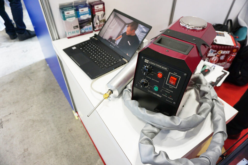 ここからはドイツを離れて、デンマークの製品をご紹介。アウトビルトジャパンでも以前「ダイヤモンドカットホイールリペアマシン」を紹介した「HBCシステムジャパン」の新商材となる「アルミニウムスプレーマシン」だ。こちらはホイールリペアのツールで、例えばアルミホイールの傷の修理は主に、傷の部分を削るかアルミパテを盛って整えるのが常だが、ホイールがダイヤモンドカットホイールだったりするとパテを盛ることはNG。そこで「アルミニウムスプレーマシン」の出番だ。ノズルからホイールの傷に溶射することで傷を整える。そのあと「ダイヤモンドカットホイールリペアマシン」で仕上げれば完了となるわけだ。ダイヤモンドカットホイールが増える一方でリペアができるところは意外と少ないため、ディーラーや整備工場からの引き合いが増えているという。