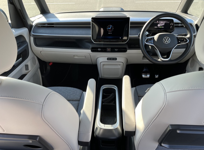 今回、フォルクスワーゲンジャパンは3台のID.Buzzを会場に持ち込んだ。試乗したモデルはキャンディホワイト/スターライトブルーメタリックの1台で、ツートンカラーがワーゲンバスの面影もあり、お洒落である。
