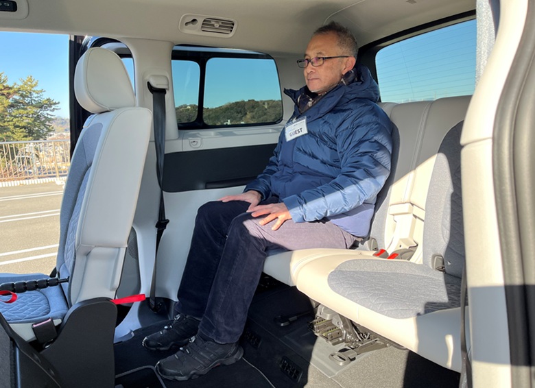 室内空間については、EVミニバンはレイアウト的に有利なこともあり広く、ロングホイールベースであることが相まって非常に広い。ID.Buzzのホイールベースはなんと3,240mm!アルファードのホイールベースが3,000mmだからその長さは明らかだ。床下に低く平らに置かれたバッテリーレイアウトにより、室内高も十分で、明るく広大な室内空間を感じられる。