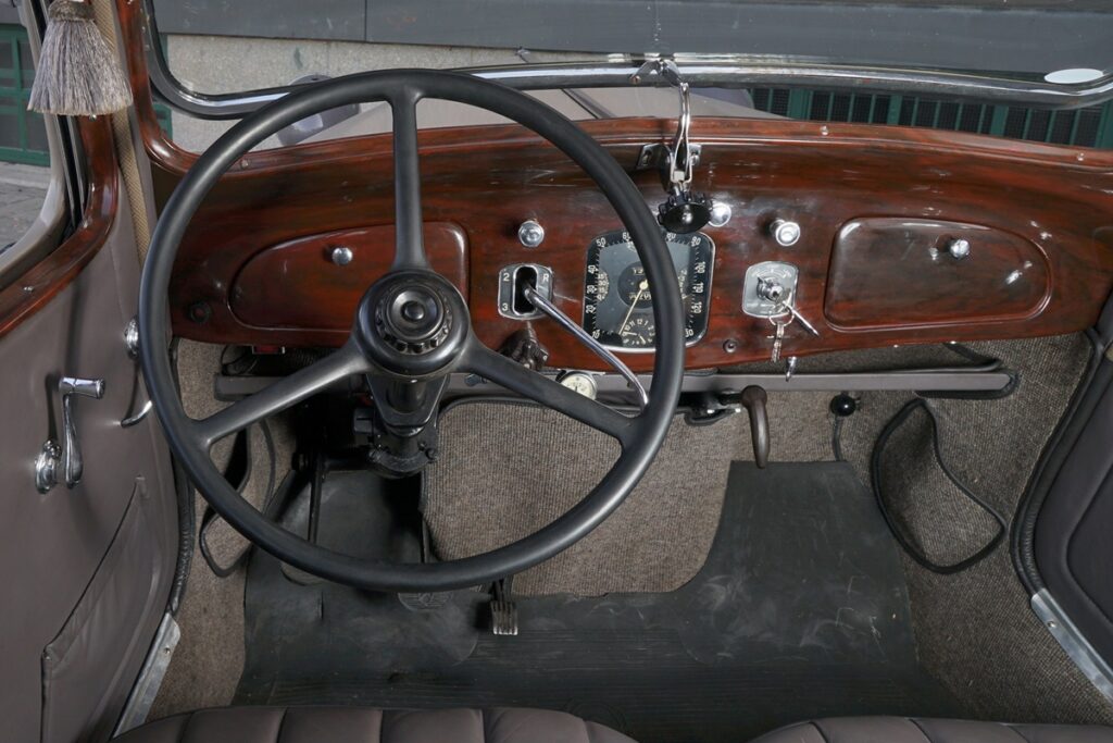 さあ出発だ!ライトスイッチ内のキーを右に回し、チョークを引き、アクセルを踏み、フロントガラス下のスターターケーブルを引く―ほら、スムーズかつ静かにエンジンがかかった。クラッチは力を要するが、ギアチェンジは心地よく、正確に入る。リバース(右上)と1速(右下)は抵抗なく入る。2速と3速(左側上下)はややコツが必要だ。