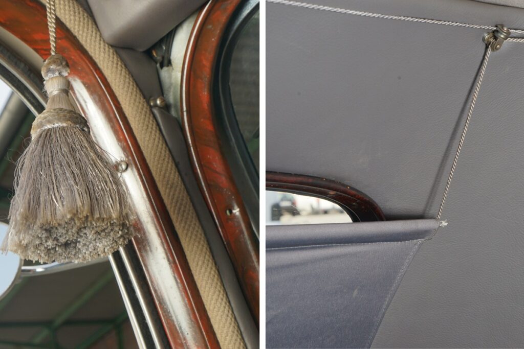 この7フロントが見せるおそらく最も愉快なショーは、ロールブラインドの開閉だ。運転席左上のタッセルを引くと、アイレットを通って後方へ伸びる2本のコードが引かれ、ブラインドが巻き上がる。