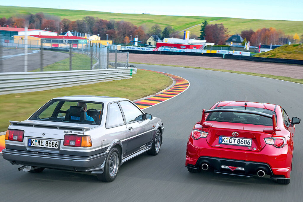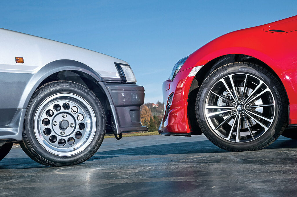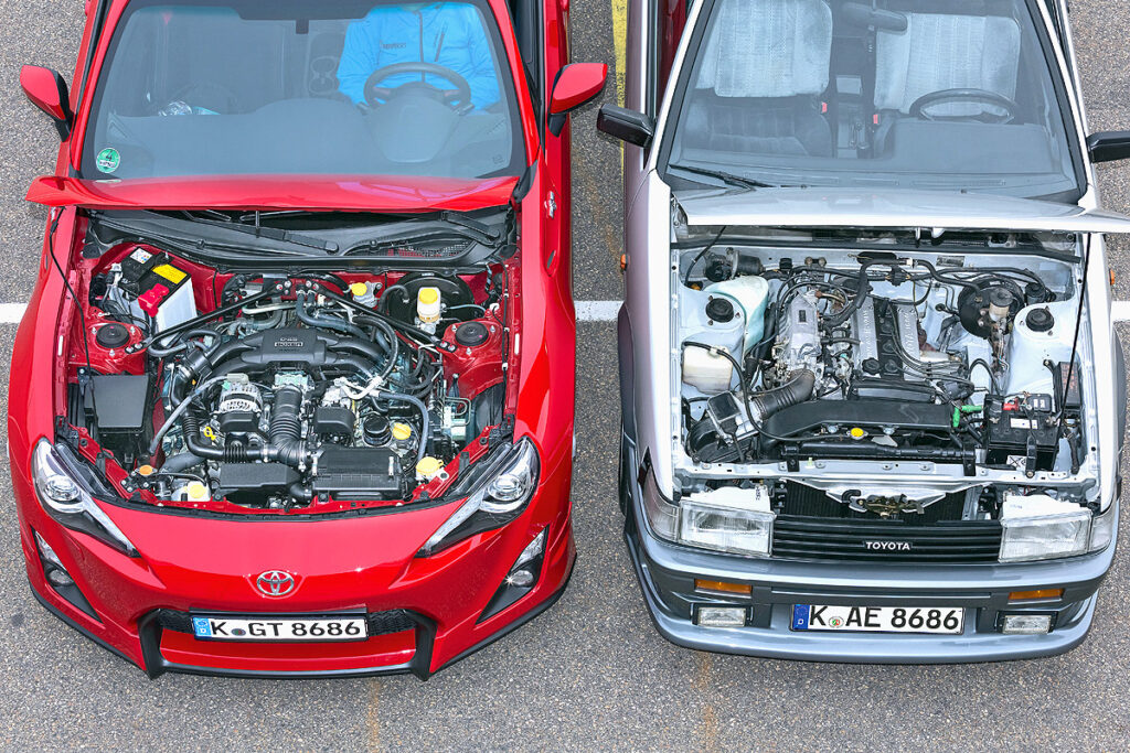 AE86とGT86の間には約30年の歳月が横たわる。走らせれば、その差は明確だ。角ばったボディと高回転4バルブを持つ旧型は、空力とボクサーエンジンを武器とする現代マシンにサーキットで太刀打ちできない。