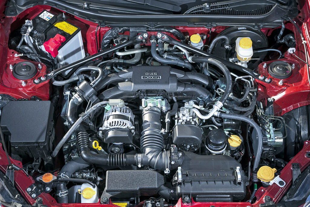 直径365mmのステアリングは、トヨタ市販車史上最小。ボンネット下には200psを発生する2リッター水平対向4気筒。このボクサーエンジンはスバル製で、GT86はスバル BRZとほぼ兄弟関係にある。