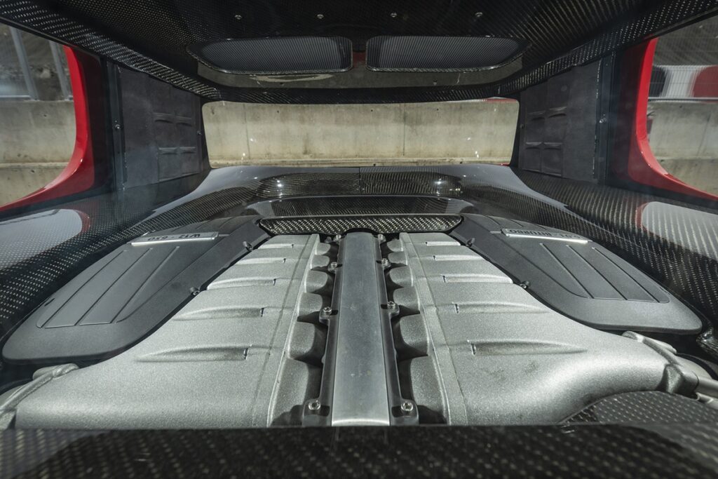 バケットシートには硬質パッドが敷かれ、コクピット自体は量産モデルの面影を残しているものの、随所にレーシングカーさながらのギミックが備わる。ダッシュボード上の追加メーター、保護カバー付きのトグルスイッチ、そしてかつてグローブボックスがあった位置にはブラックの「W12」消火器。ESPですら簡単には解除できない。まずカバーを持ち上げ、次にスイッチを倒す―小さな儀式を経て初めて解き放たれる。このクルマは、暴れさせる前に一瞬の思考を求めてくる。
