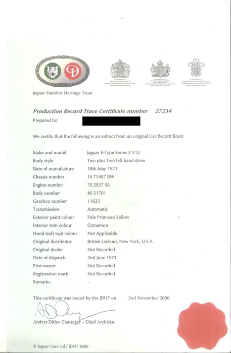 ジャガー・ダイムラー・ヘリテージ・トラスト証明書には、工場出荷時のボディカラー、ドライブトレイン番号、そして1971年6月の出荷日が記載されている。