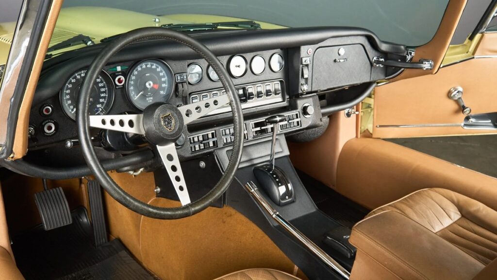レザー巻きステアリングの奥には、Smiths製160mphスピードメーターとタコメーターが配置され、補助メーターがダッシュボードに取り付けられている。5桁オドメーターは3万2000マイルを示しており、そのうち約1万マイルは現オーナーの所有期間中に追加された。