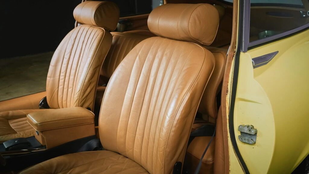 シナモンカラーのレザーがフロントのバケットシートとリアベンチシートを覆う。販売準備として、運転席側の張地の補修が行われた。エアコンシステムはR-134a冷媒に対応するよう改修されている。