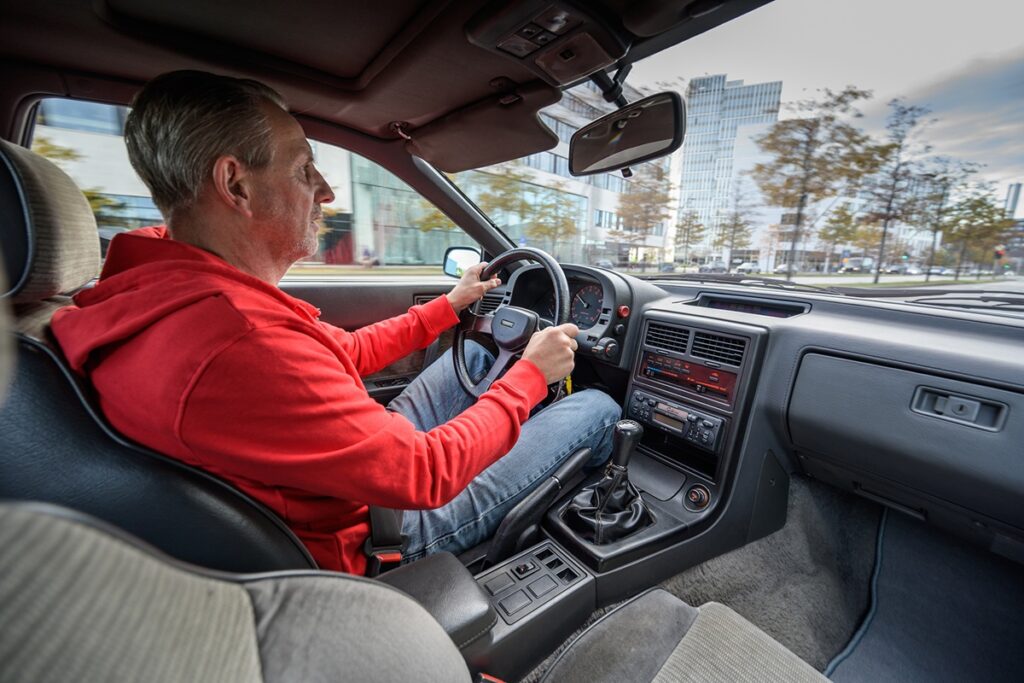 「RX-7」は信じられないほどスリムで小柄な印象を与えるが、実際その通りだ。全長4.31メートル、全幅1.69メートル、全高1.27メートル、ホイールベースは2.43メートルと、まさにコンパクトそのものだ。果たして我々はそこに収まるのか?もちろん収まる!スペースは限られており、長身の編集者ブランケ(Branke)とチャイカ(Czajka)は、今日の基準からすればかなり小柄なシートに収まるまで少し体を折り曲げなければならないが、一度座ればすべてがぴったりとフィットする。美しいクラシックな丸型計器は視認性が抜群だ – 飾り気なく実用的に造られたコックピットのどこも、デザイン博物館に展示されるようなものではない。すべて直感的に操作できる機械式のボタン、レバー、スイッチに至ってはなおさらだ。